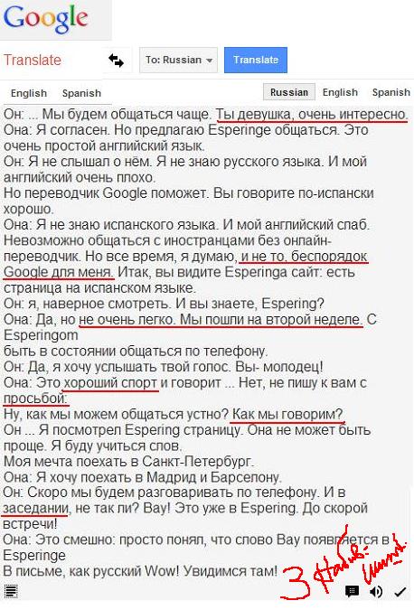 непревзойдённый синхронный переводчик-полиглот Козьма Набивший-Шишкин-- слишком строг. Можно было снизойти и до "5 с минусом". Google всё же "хороший спорт". А как мы говорим?.. Так что, пошёл Козьма в... заседание. Дело не в оценке. А в чём? А в том, что это... Только для переписки... Ни поговорить лицом к лицу, ни поболтать по телефону. Или же Ей- учить испанский (либо любые из 7000 языков, если Он-Она знают другие), или Ему- учить русский (либо любые из 7000 языков). Но! онлайн переводчики, как видите, жутко перевирают, и при этом онлайн не краснеют, а здесь у нас- таки да, как вы заметили. Как же быть? А быть с Эсперингом! (см. ниже) * Прав, ох, как прав К. Н.-Ш., подтвердивший вслед за Дж. Оруэллом: Английский язык- очень лёгкий для того, чтобы говорить на нём плохо, и... очень удобный, чтобы переводить с него ещё хуже. Когда же Ст.Балакин сокрушился, дескать: "Все умеют говорить, а сказать никто не может",- наш парадоксальный синхронист К. Н.-Ш. моментально подтвердил: Все сумеют сказать, если все заговорят на Эсперинге. | ||||||||||||||||||