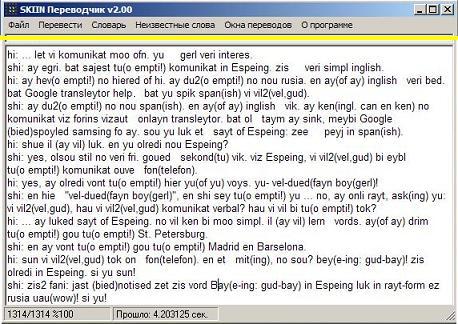 без основного окна Переводчика, но чтобы продолжить работу в этом окне, из Словаря надо выходить. Да, кстати, окно Skiin можно растягивать и по горизонтали, и по вертикали, либо за его уголки (что удобно, если запись в Словаре длинная). -------- Очередной пункт Меню- 4-ая кнопка Неизвестные слова. Нажали и получили ещё одно окошко. В нём слева и сверху вниз 4 строки: Всего слов (т.е. было в переводимом тексте), Неизвестных (т.е. не найденных в словаре), Известных (дабы не заниматься арифметикой), Неизвестных/Все (в % от всех слов). Если оказались "незвестные", т.е. непереведенные слова, то они уже красуются ниже в большом поле построчно. Выделите нужную строчку, и слово появится выше в левой "щели". Введите рядом справа его перевод на э-инг, взятый из тех же словарей на сайте (а может, уже и скачанных вами к себе на комп!), и нажмите справа рядом Перевести- слово тут же перекочует в словарь Skiin. Ещё пополнение! Пришла очередь предпоследней и всего-то 5-ой кнопки Меню- Окна Переводов. Здесь всё даже ещё проще: Очистить окно переводимого текста Ctrl+F1 (горяч. клавиши для англ. сверху текста), Очистить окно переведенного текста Ctrl+F2 (нижнего, на э-инге), Очистить оба окна Ctrl+F3 (и желательно таки почаще это проделывать!- после каждого текста, дабы они не путались друг у друга под...буквами), Установка размера шрифта Ctrl+F6 (удобная опция, ничего не скажешь). А уж последнюю кнопку Меню- О программе- можно и вообще не трогать- ничего там важного нет: версия, дата, адрес сайта программы и только. Вот мы и добрались до нижнего края окна Skiin, где видим 2 надписи: Прогресс (в %) и правее- Прошло (т.е. времени работы в программе). И всех-то дел! 11 горячих клавиш и никаких гвоз... кнопок и надписей. Да и из той недодюжины- можно обойтись одной F5- перевод! Ну, ещё Ctrl+F3 - очистка обоих окон. Программа о "Три Клавиши"! Так надо ли было столько мусолить её описание?! А это мы спросим у тех, кто не смог ничего сам прочитать из надписей в этой загадочной для них, как русская душа, программе. А любопытство на даёт покою... (эту инструкцию мы переведём и для них- хотя бы на 8 основных языков) Желаем вам приятных бесед за Skiin Англо-Эсперинг Переводчиком с собеседниками со всего света и на всеобщем языке! (возврат к Содержанию этой стр.) (возврат к Содержанию Переводчика) * * * * * * * 4. Вот реальная история, обещающая стать "лав-стори" (love story, lav stori- э-инг). Она же- ИСТОРИЯ испытаний- полевых, т.е. в интернете, но реальных!- нашего Skiin Англо-Эсперинг Переводчика в связке с коллегой Google Переводчиком. Вот они- отрывки из спровоцированного (с благой целью!) диалога в Фейсбуке между девушкой из России и парнем из Испании (ничего не исправлялось- только сократили всю переписку!) Совет: применять простые, правильные слова- в коротких предложениях. Итак, вот, что оба ХОТЕЛИ сказать друг другу- сначала на правильном русск.: Он (переводя в переводчике Google с исп. на русск.): ...Давай общаться почаще. С тобой интересно. Она (так же переводя в переводчике Google с русск. на исп.): Согласна. Но предлагаю общаться на эсперинге. Это очень простой английский язык. Он: Не слыхал о таком. Я не знаю русского. И мой английский очень плохой. Но переводчик Google помогает. А ты неплохо говоришь на испанском. Она: Я тоже не знаю испанского. И мой английский слабый. И мне без онлайн переводчика заграницу никуда и ни с кем. Но я всё время думаю, а не ляпнул ли Google что-то вместо меня. 